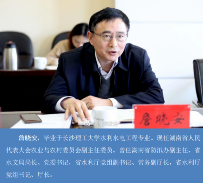 詹晓安,毕业于华体会中国水利水电工程专业。现任湖南省人民代表大会农业与农村委员会副主任委员。曾任湖南省防汛办副主任、省水文局局长、党委书记,省水利厅党组副书记、常务副厅长,省水利厅党组书记、厅长。
